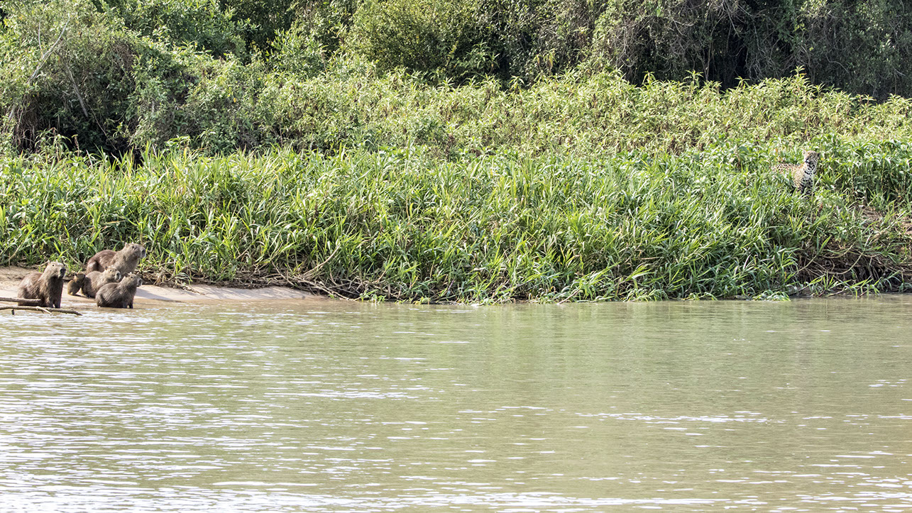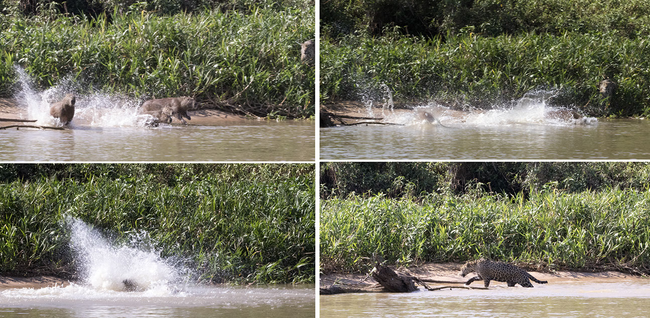 JAGUAR (ON RIGHT) PREPARING TO ATTACK CAPYBARA FAMILY. . .